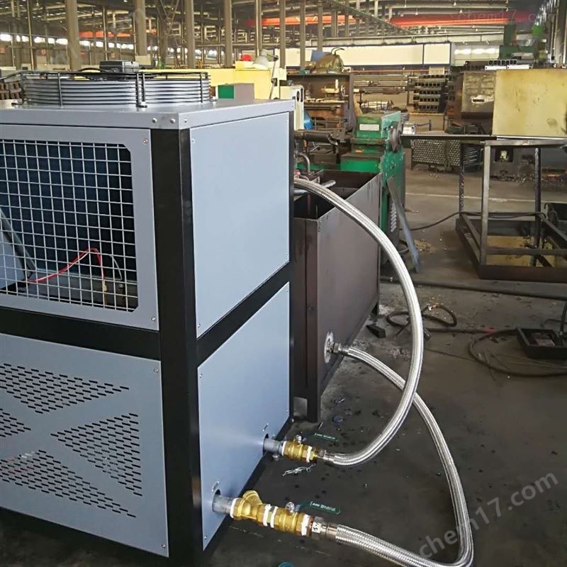 风冷式冷水机与一般用水冷却设备是不同的,具有独立的制冷系统,会受气温及环境的影响.风冷水机冷水机主要由压缩机,冷凝器,蒸发器,膨胀阀及电控系统组成,其工作原理是压缩机从蒸发器中吸入低温低压的气态冷媒,将其压缩,形成高温高压液态进入冷凝器进行散热,转换成常温高压饱和蒸汽,通过膨胀阀的喷射,进入蒸发器,转化为低温低压的气体,与蒸发器中的水进行热交换,吸收水中的热量,从而产生冷冻水,通过循环泵进入需要冷却的设备或是产品,完成制冷工艺.